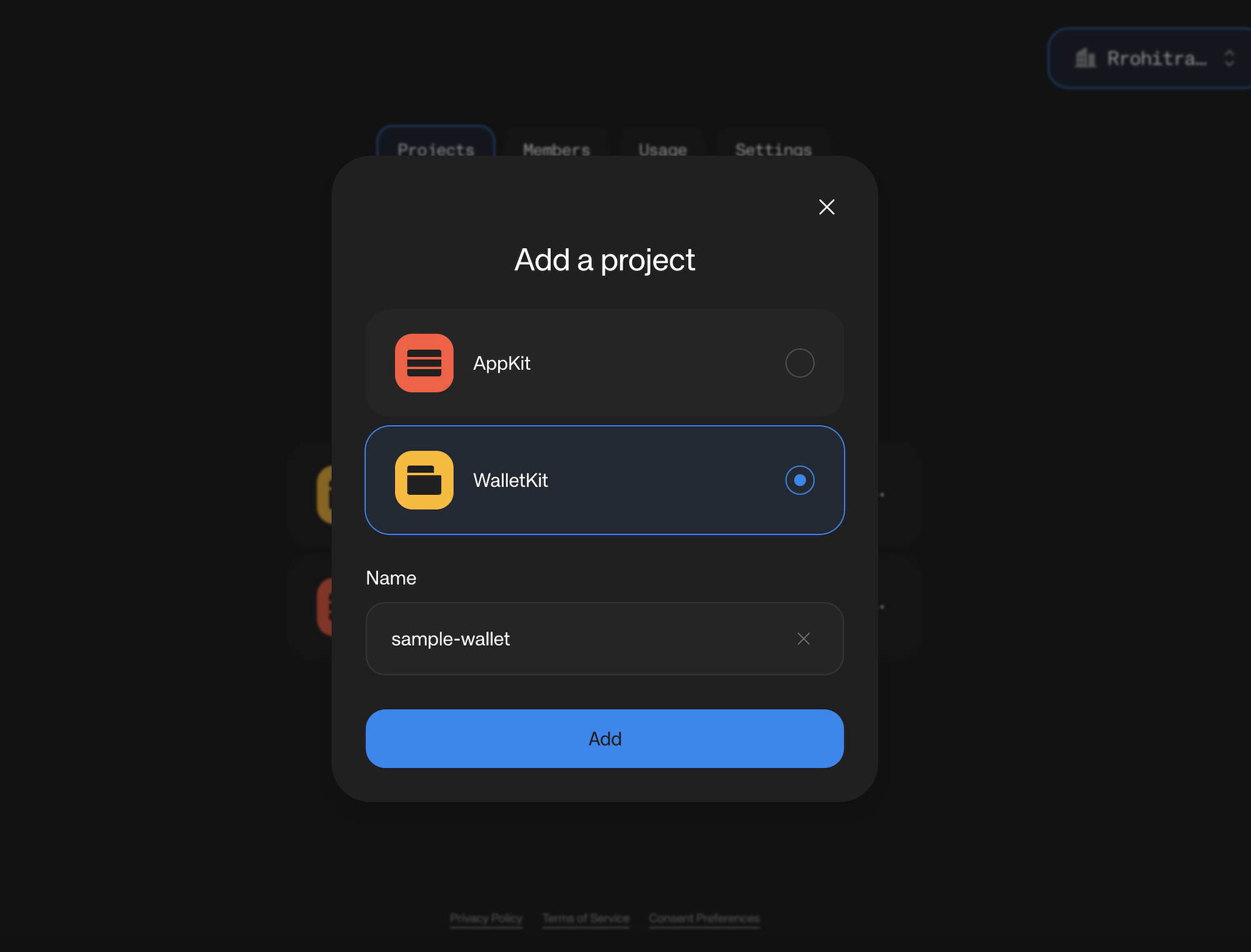 Give a suitable name for your project, select Wallet (WalletKit) and click the “Create” button. You can change the name for your project later.