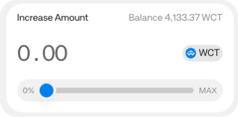You can increase your staking position by adding more WCT tokens at any time. The added tokens will be locked for the remaining duration of your position.