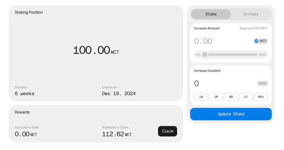 Users can update their active (non-expired) staking positions at any time. There are two types of updates available: adding more WCT tokens and extending the lock period.Adding WCT