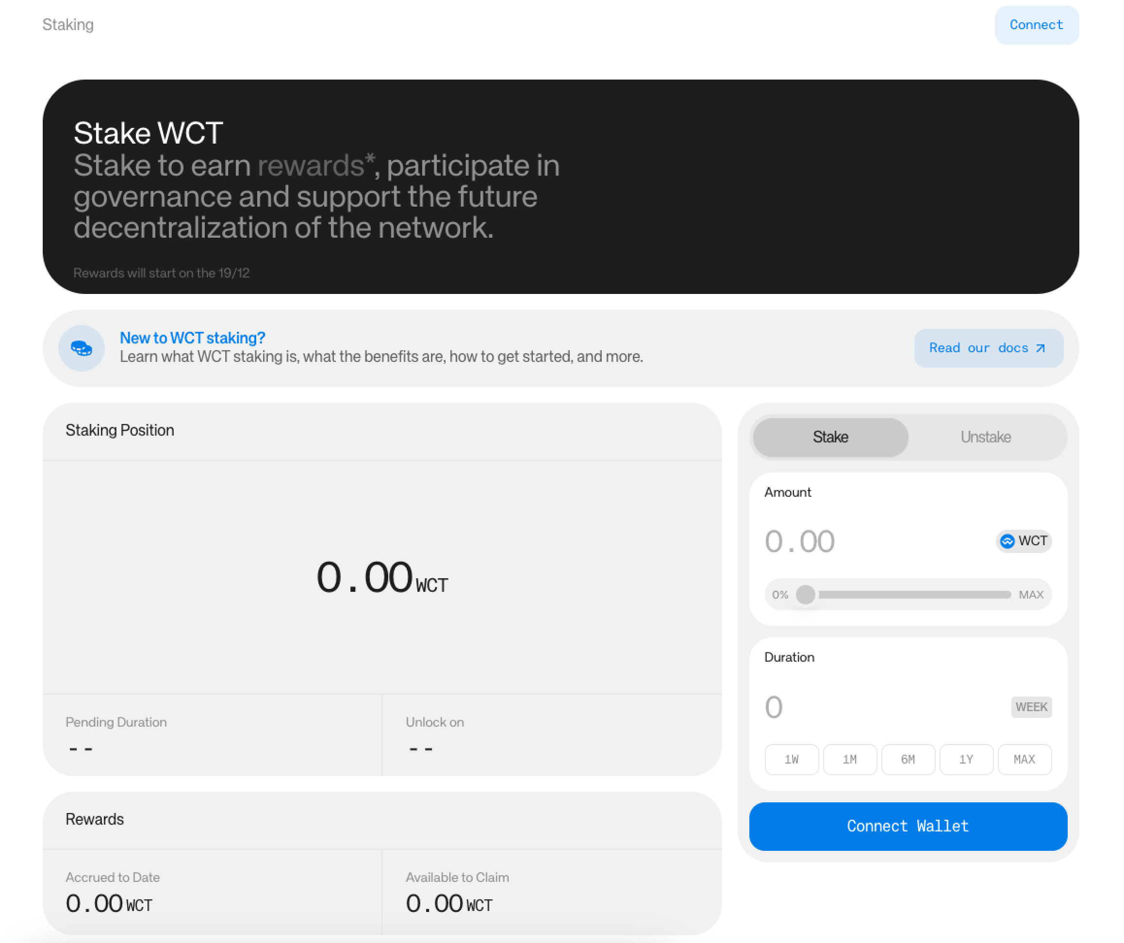 A staking position’s stakeweight naturally decays each week as the lock time decreases. To maintain or increase their stakeweight, users have two options: they can deposit additional WCT tokens into their existing position, or they can extend their lock time period. Both actions will result in an increased stakeweight, allowing users to maintain or improve their proportional share of rewards.How to Stake WCT