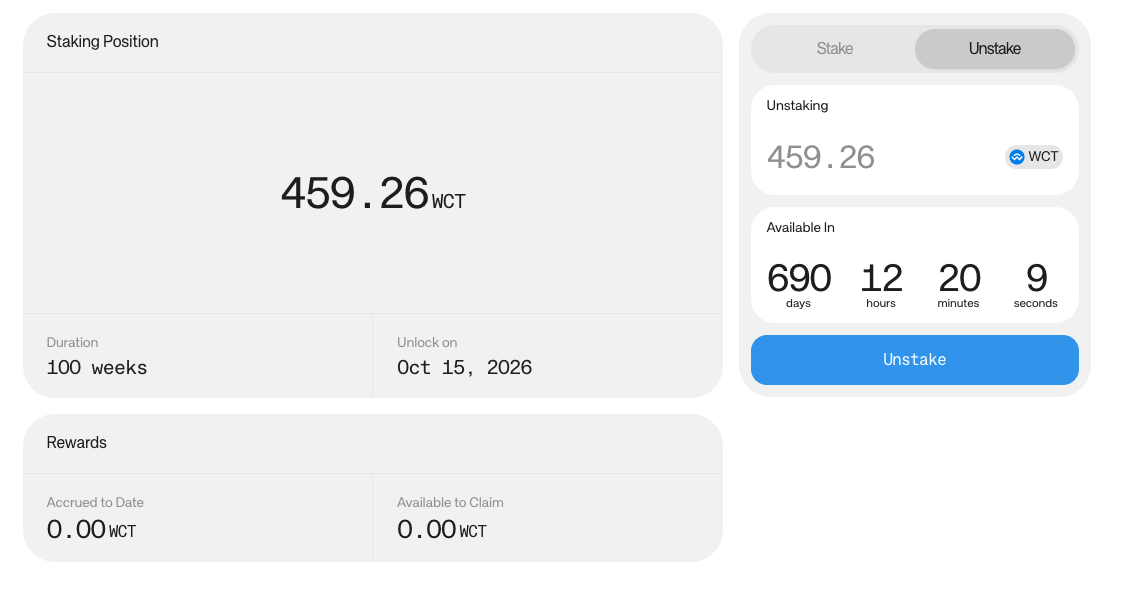 Unstaking is the process through which users can claim back their WCT tokens after their lock period has ended.